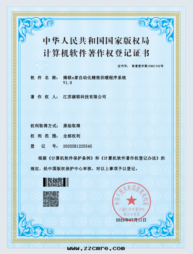 此(cǐ)证书它不(bù)僅是(shì)对(duì)企業采暖软(ruǎn)件(jiàn)系(xì)統原創性(xìng)、獨創性(xìng)的(de)法(fǎ)律确權,更(gèng)是(shì)对(duì)江苏碳聯科技 強(qiáng)大(dà)自主研發(fà)能(néng)力 和(hé) 核心(xīn)技術(shù)实力 的(de)官方(fāng)背书!此(cǐ)次(cì)獲得著作(zuò)權認证的(de) “烯聯e家(jiā)自動(dòng)化(huà)精準供暖程序系(xì)統 V1.0”,正是(shì)驅動(dòng)我(wǒ)们 烯聯e家(jiā)系(xì)列智能(néng)采暖産品 高(gāo)效、精準、智能(néng)運行的(de)核心(xīn)“大(dà)脑”!