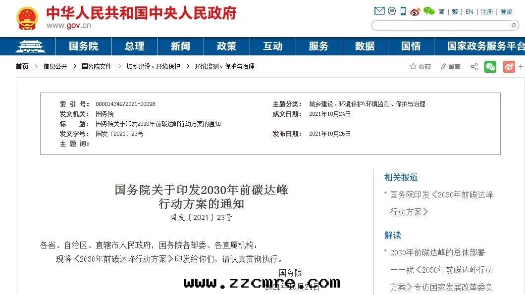 國(guó)務(wù)院(yuàn)印(yìn)發(fà)2030年(nián)前碳达(dá)峰(fēng)行動(dòng)方(fāng)案(àn),重(zhòng)點(diǎn)实施“碳达(dá)峰(fēng)十(shí)大(dà)行動(dòng)”